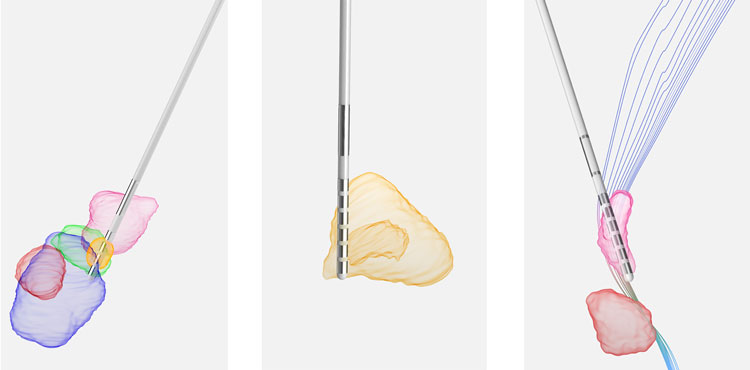 3-D Darstellung des individuellen Patientengehirns mit der implantierten THS-Elektrode (Vercise™ Cartesia™ X) und den zu stimulierenden Strukturen für drei verschiedene Zielgebiete.